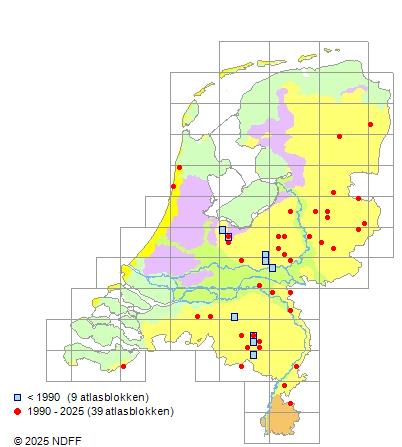 Het aantal atlasblokken (5x5 km) waarin de soort is gemeld binnen een periode van vijf jaar (vanaf 1980) of twintig jaar. Niet gecorrigeerd voor waarnemersinspanning en het aantal doorgegeven waarnemingen kan sterk variëren per periode, dus een trend in verspreiding kan hier niet direct uit worden afgelezen. Het opgegeven jaartal is het eerste jaar van de periode. Bron: gevalideerde waarnemingen uit de NDFF.