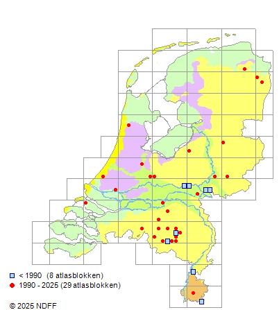 Het aantal atlasblokken (5x5 km) waarin de soort is gemeld binnen een periode van vijf jaar (vanaf 1980) of twintig jaar. Niet gecorrigeerd voor waarnemersinspanning en het aantal doorgegeven waarnemingen kan sterk variëren per periode, dus een trend in verspreiding kan hier niet direct uit worden afgelezen. Het opgegeven jaartal is het eerste jaar van de periode. Bron: gevalideerde waarnemingen uit de NDFF.
