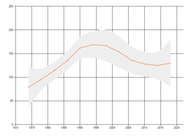 Gemiddelde trend van het aantal kilometerhokken waarin de soort voorkomt, weergegeven als indexcijfer (1975-1978 = 100). De trend is gecorrigeerd voor waarnemersinspanning en geeft de relatieve verandering in het aantal bezette kilometerhokken weer. Voor de berekening worden de data per periode van vier jaar samengenomen. In de grafiek correspondeert ieder punt met het laatste jaar van zo'n periode.