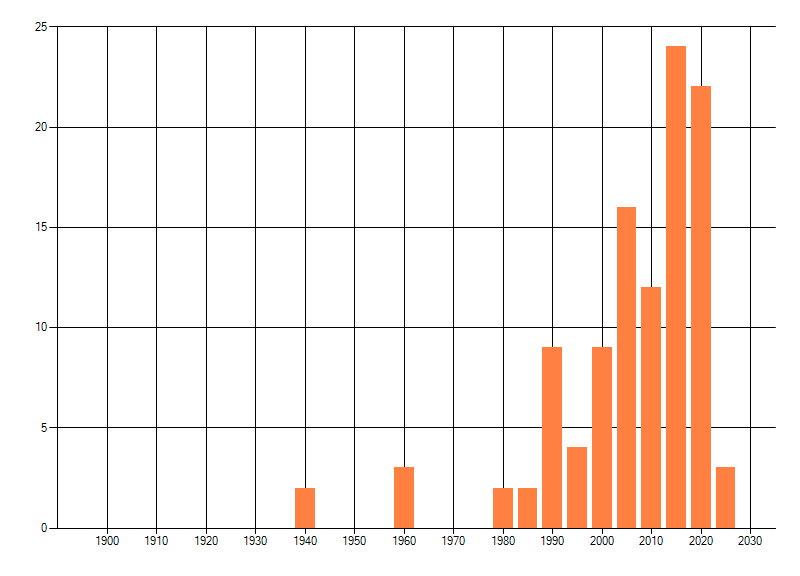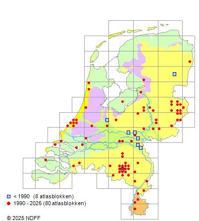 Het aantal atlasblokken (5x5 km) waarin de soort is gemeld binnen een periode van vijf jaar (vanaf 1980) of twintig jaar. Niet gecorrigeerd voor waarnemersinspanning en het aantal doorgegeven waarnemingen kan sterk variëren per periode, dus een trend in verspreiding kan hier niet direct uit worden afgelezen. Het opgegeven jaartal is het eerste jaar van de periode. Bron: gevalideerde waarnemingen uit de NDFF.