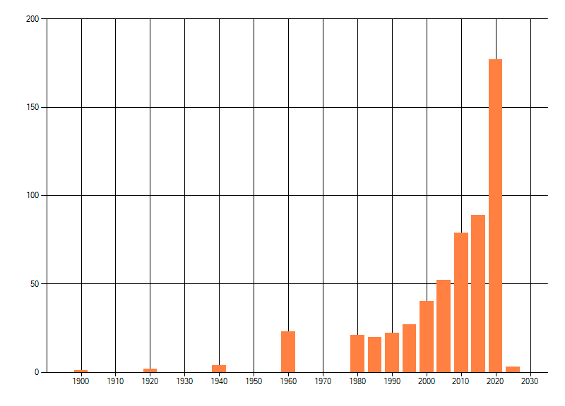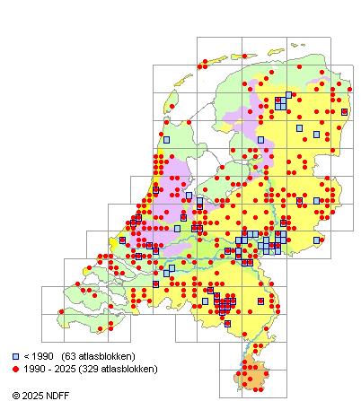 Het aantal atlasblokken (5x5 km) waarin de soort is gemeld binnen een periode van vijf jaar (vanaf 1980) of twintig jaar. Niet gecorrigeerd voor waarnemersinspanning en het aantal doorgegeven waarnemingen kan sterk variëren per periode, dus een trend in verspreiding kan hier niet direct uit worden afgelezen. Het opgegeven jaartal is het eerste jaar van de periode. Bron: gevalideerde waarnemingen uit de NDFF.