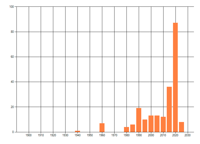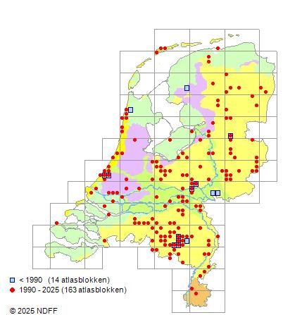 Het aantal atlasblokken (5x5 km) waarin de soort is gemeld binnen een periode van vijf jaar (vanaf 1980) of twintig jaar. Niet gecorrigeerd voor waarnemersinspanning en het aantal doorgegeven waarnemingen kan sterk variëren per periode, dus een trend in verspreiding kan hier niet direct uit worden afgelezen. Het opgegeven jaartal is het eerste jaar van de periode. Bron: gevalideerde waarnemingen uit de NDFF.