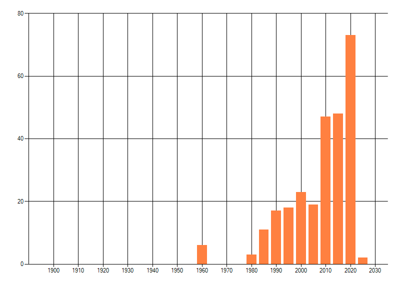 Het aantal atlasblokken (5x5 km) waarin de soort is gemeld binnen een periode van vijf jaar (vanaf 1980) of twintig jaar. Niet gecorrigeerd voor waarnemersinspanning en het aantal doorgegeven waarnemingen kan sterk variëren per periode, dus een trend in verspreiding kan hier niet direct uit worden afgelezen. Het opgegeven jaartal is het eerste jaar van de periode. Bron: gevalideerde waarnemingen uit de NDFF.