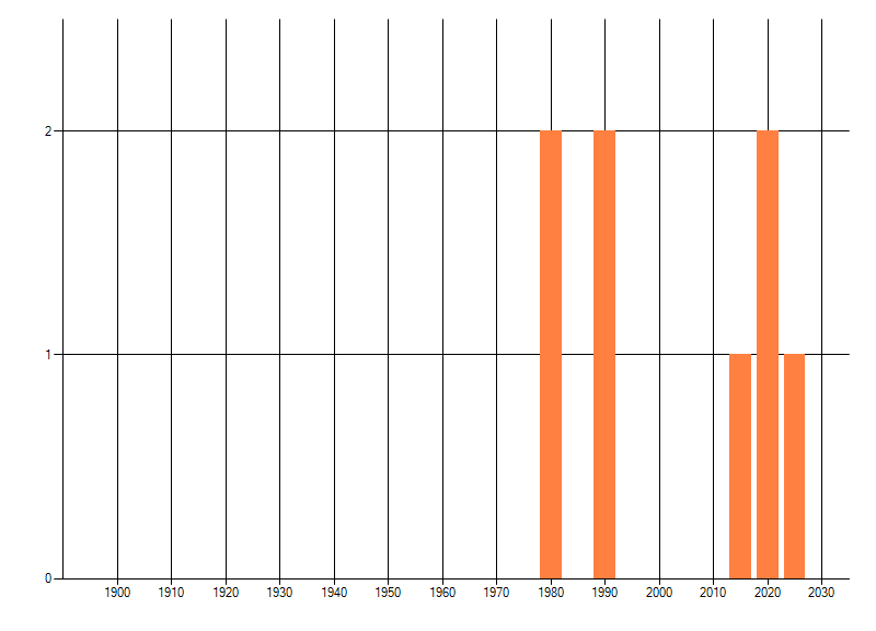 Het aantal atlasblokken (5x5 km) waarin de soort is gemeld binnen een periode van vijf jaar (vanaf 1980) of twintig jaar. Niet gecorrigeerd voor waarnemersinspanning en het aantal doorgegeven waarnemingen kan sterk variëren per periode, dus een trend in verspreiding kan hier niet direct uit worden afgelezen. Het opgegeven jaartal is het eerste jaar van de periode. Bron: gevalideerde waarnemingen uit de NDFF.