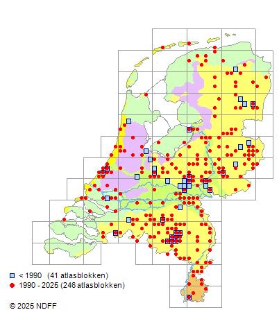 Het aantal atlasblokken (5x5 km) waarin de soort is gemeld binnen een periode van vijf jaar (vanaf 1980) of twintig jaar. Niet gecorrigeerd voor waarnemersinspanning en het aantal doorgegeven waarnemingen kan sterk variëren per periode, dus een trend in verspreiding kan hier niet direct uit worden afgelezen. Het opgegeven jaartal is het eerste jaar van de periode. Bron: gevalideerde waarnemingen uit de NDFF.