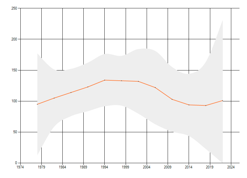 Gemiddelde trend van het aantal kilometerhokken waarin de soort voorkomt, weergegeven als indexcijfer (1975-1978 = 100).