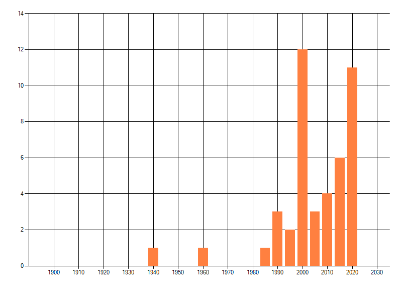 Het aantal atlasblokken (5x5 km) waarin de soort is gemeld binnen een periode van vijf jaar (vanaf 1980) of twintig jaar. Niet gecorrigeerd voor waarnemersinspanning en het aantal doorgegeven waarnemingen kan sterk variëren per periode, dus een trend in verspreiding kan hier niet direct uit worden afgelezen. Het opgegeven jaartal is het eerste jaar van de periode. Bron: gevalideerde waarnemingen uit de NDFF.