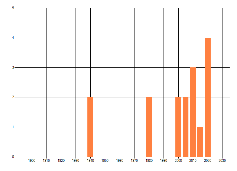 Het aantal atlasblokken (5x5 km) waarin de soort is gemeld binnen een periode van vijf jaar (vanaf 1980) of twintig jaar. Niet gecorrigeerd voor waarnemersinspanning en het aantal doorgegeven waarnemingen kan sterk variëren per periode, dus een trend in verspreiding kan hier niet direct uit worden afgelezen. Het opgegeven jaartal is het eerste jaar van de periode. Bron: gevalideerde waarnemingen uit de NDFF.