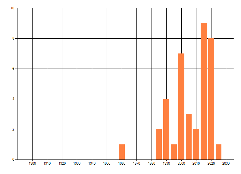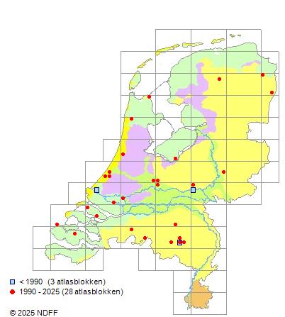 Het aantal atlasblokken (5x5 km) waarin de soort is gemeld binnen een periode van vijf jaar (vanaf 1980) of twintig jaar. Niet gecorrigeerd voor waarnemersinspanning en het aantal doorgegeven waarnemingen kan sterk variëren per periode, dus een trend in verspreiding kan hier niet direct uit worden afgelezen. Het opgegeven jaartal is het eerste jaar van de periode. Bron: gevalideerde waarnemingen uit de NDFF.