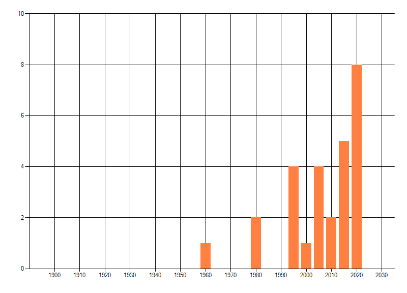 Het aantal atlasblokken (5x5 km) waarin de soort is gemeld binnen een periode van vijf jaar (vanaf 1980) of twintig jaar. Niet gecorrigeerd voor waarnemersinspanning en het aantal doorgegeven waarnemingen kan sterk variëren per periode, dus een trend in verspreiding kan hier niet direct uit worden afgelezen. Het opgegeven jaartal is het eerste jaar van de periode. Bron: gevalideerde waarnemingen uit de NDFF.