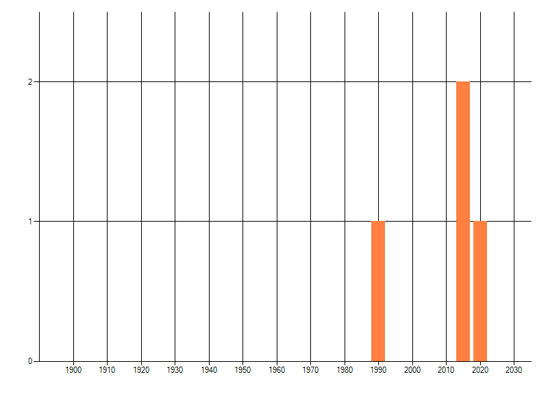 Het aantal atlasblokken (5x5 km) waarin de soort is gemeld binnen een periode van vijf jaar (vanaf 1980) of twintig jaar. Niet gecorrigeerd voor waarnemersinspanning en het aantal doorgegeven waarnemingen kan sterk variëren per periode, dus een trend in verspreiding kan hier niet direct uit worden afgelezen. Het opgegeven jaartal is het eerste jaar van de periode. Bron: gevalideerde waarnemingen uit de NDFF.