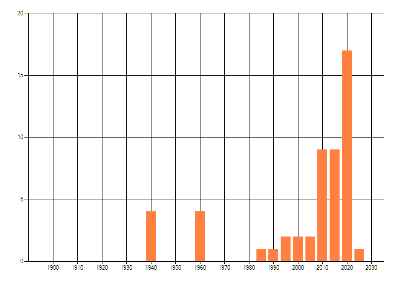 Het aantal atlasblokken (5x5 km) waarin de soort is gemeld binnen een periode van vijf jaar (vanaf 1980) of twintig jaar. Niet gecorrigeerd voor waarnemersinspanning en het aantal doorgegeven waarnemingen kan sterk variëren per periode, dus een trend in verspreiding kan hier niet direct uit worden afgelezen. Het opgegeven jaartal is het eerste jaar van de periode. Bron: gevalideerde waarnemingen uit de NDFF.