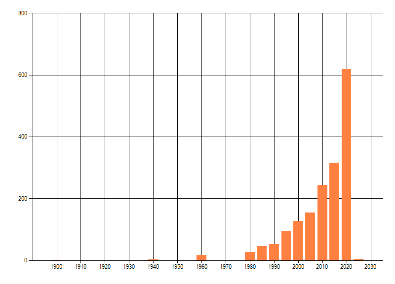 Het aantal atlasblokken (5x5 km) waarin de soort is gemeld binnen een periode van vijf jaar (vanaf 1980) of twintig jaar. Niet gecorrigeerd voor waarnemersinspanning en het aantal doorgegeven waarnemingen kan sterk variëren per periode, dus een trend in verspreiding kan hier niet direct uit worden afgelezen. Het opgegeven jaartal is het eerste jaar van de periode. Bron: gevalideerde waarnemingen uit de NDFF.