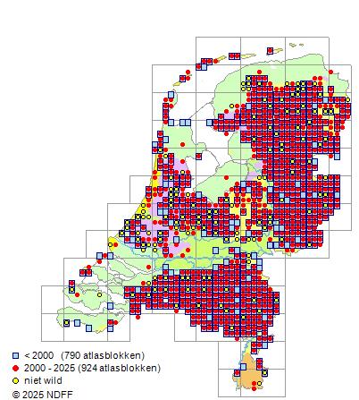 CC BY-NC-SA 3.0 NLVerspreidingNederlandPlaatselijk vrij algemeen in het noordoosten, oosten en midden van het land en in Noord-Brabant, zeldzaam in de veengebieden in Noord- en Zuid-Holland en zeer zeldzaam in het kustbebied en Zuid-Limburg.