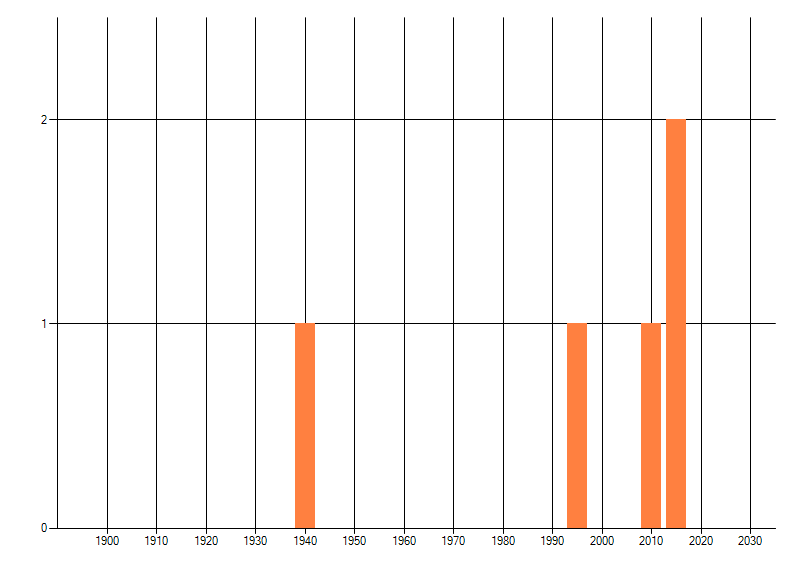 Het aantal atlasblokken (5x5 km) waarin de soort is gemeld binnen een periode van vijf jaar (vanaf 1980) of twintig jaar. Niet gecorrigeerd voor waarnemersinspanning en het aantal doorgegeven waarnemingen kan sterk variëren per periode, dus een trend in verspreiding kan hier niet direct uit worden afgelezen. Het opgegeven jaartal is het eerste jaar van de periode. Bron: gevalideerde waarnemingen uit de NDFF.