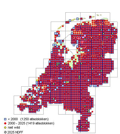 CC BY-NC-SA 3.0 NLVerspreidingNederlandPlaatselijk vrij algemeen, vooral in stedelijke gebieden, maarn zeldzaam in Zeeland, op de Waddeneilanden en in het noordelijk zeekleigebied.