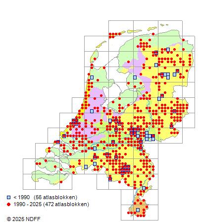 Het aantal atlasblokken (5x5 km) waarin de soort is gemeld binnen een periode van vijf jaar (vanaf 1980) of twintig jaar. Niet gecorrigeerd voor waarnemersinspanning en het aantal doorgegeven waarnemingen kan sterk variëren per periode, dus een trend in verspreiding kan hier niet direct uit worden afgelezen. Het opgegeven jaartal is het eerste jaar van de periode. Bron: gevalideerde waarnemingen uit de NDFF.