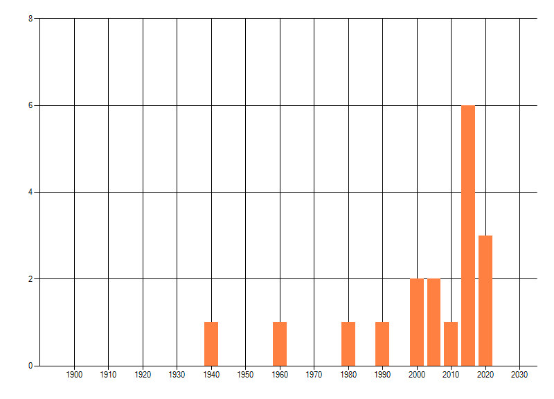 Het aantal atlasblokken (5x5 km) waarin de soort is gemeld binnen een periode van vijf jaar (vanaf 1980) of twintig jaar. Niet gecorrigeerd voor waarnemersinspanning en het aantal doorgegeven waarnemingen kan sterk variëren per periode, dus een trend in verspreiding kan hier niet direct uit worden afgelezen. Het opgegeven jaartal is het eerste jaar van de periode. Bron: gevalideerde waarnemingen uit de NDFF.