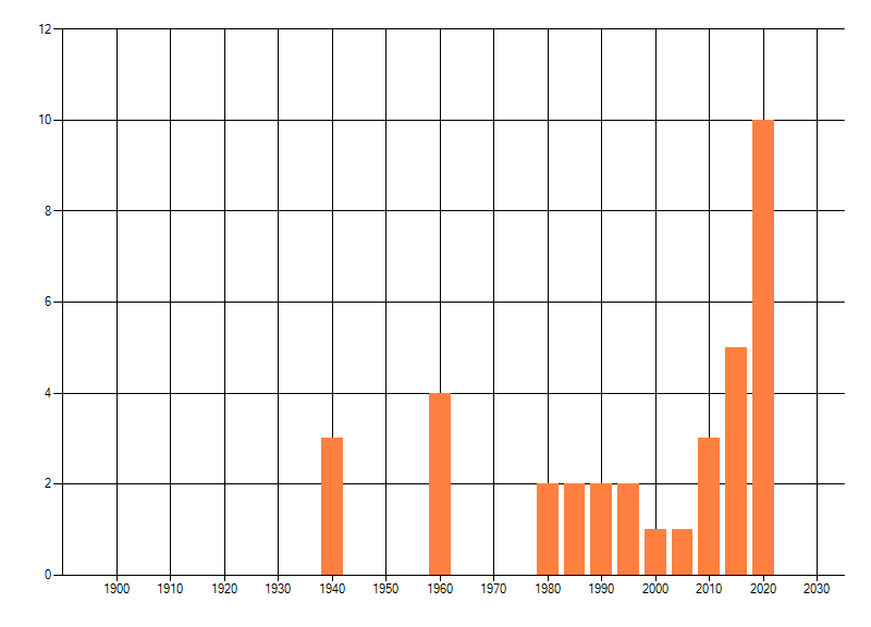 Het aantal atlasblokken (5x5 km) waarin de soort is gemeld binnen een periode van vijf jaar (vanaf 1980) of twintig jaar. Niet gecorrigeerd voor waarnemersinspanning en het aantal doorgegeven waarnemingen kan sterk variëren per periode, dus een trend in verspreiding kan hier niet direct uit worden afgelezen. Het opgegeven jaartal is het eerste jaar van de periode. Bron: gevalideerde waarnemingen uit de NDFF.