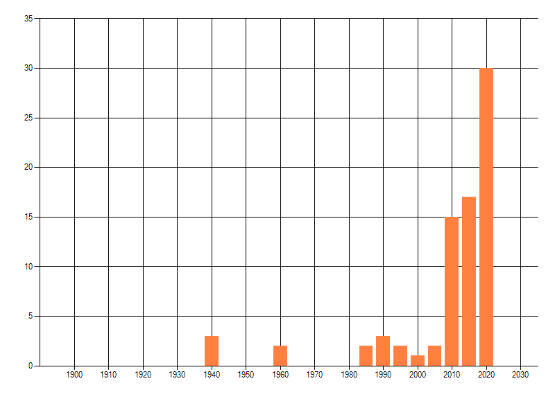 Het aantal atlasblokken (5x5 km) waarin de soort is gemeld binnen een periode van vijf jaar (vanaf 1980) of twintig jaar. Niet gecorrigeerd voor waarnemersinspanning en het aantal doorgegeven waarnemingen kan sterk variëren per periode, dus een trend in verspreiding kan hier niet direct uit worden afgelezen. Het opgegeven jaartal is het eerste jaar van de periode. Bron: gevalideerde waarnemingen uit de NDFF.