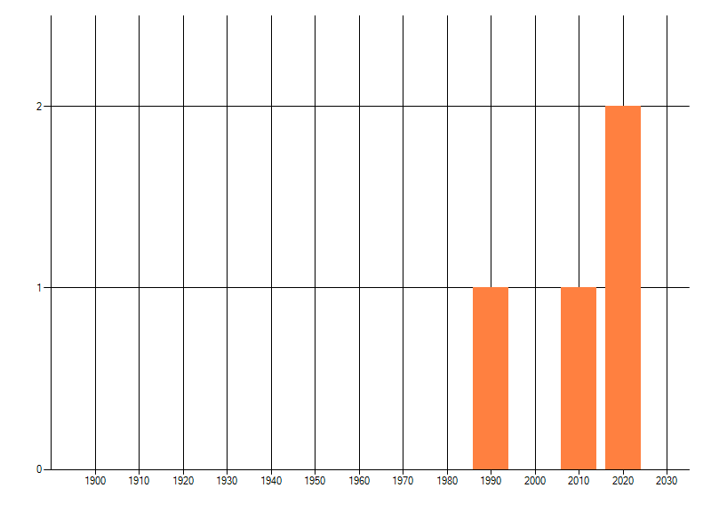 Het aantal atlasblokken (5x5 km) waarin de soort is gemeld binnen een periode van vijf jaar (vanaf 1980) of twintig jaar. Niet gecorrigeerd voor waarnemersinspanning en het aantal doorgegeven waarnemingen kan sterk variëren per periode, dus een trend in verspreiding kan hier niet direct uit worden afgelezen. Het opgegeven jaartal is het eerste jaar van de periode. Bron: gevalideerde waarnemingen uit de NDFF.