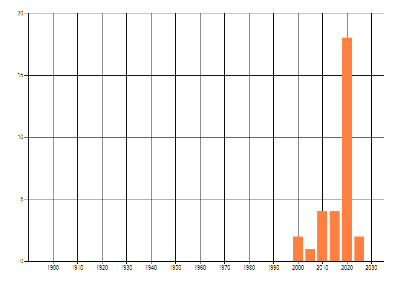 Het aantal atlasblokken (5x5 km) waarin de soort is gemeld binnen een periode van vijf jaar (vanaf 1980) of twintig jaar. Niet gecorrigeerd voor waarnemersinspanning en het aantal doorgegeven waarnemingen kan sterk variëren per periode, dus een trend in verspreiding kan hier niet direct uit worden afgelezen. Het opgegeven jaartal is het eerste jaar van de periode. Bron: gevalideerde waarnemingen uit de NDFF.