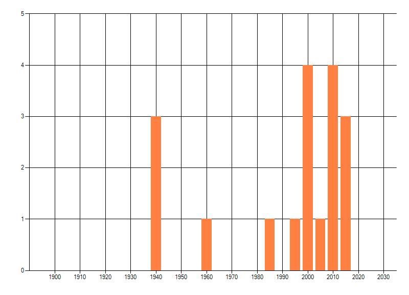Het aantal atlasblokken (5x5 km) waarin de soort is gemeld binnen een periode van vijf jaar (vanaf 1980) of twintig jaar. Niet gecorrigeerd voor waarnemersinspanning en het aantal doorgegeven waarnemingen kan sterk variëren per periode, dus een trend in verspreiding kan hier niet direct uit worden afgelezen. Het opgegeven jaartal is het eerste jaar van de periode. Bron: gevalideerde waarnemingen uit de NDFF.