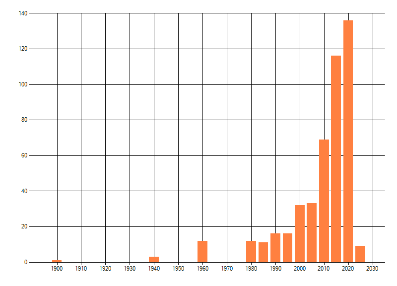 Het aantal atlasblokken (5x5 km) waarin de soort is gemeld binnen een periode van vijf jaar (vanaf 1980) of twintig jaar. Niet gecorrigeerd voor waarnemersinspanning en het aantal doorgegeven waarnemingen kan sterk variëren per periode, dus een trend in verspreiding kan hier niet direct uit worden afgelezen. Het opgegeven jaartal is het eerste jaar van de periode. Bron: gevalideerde waarnemingen uit de NDFF.