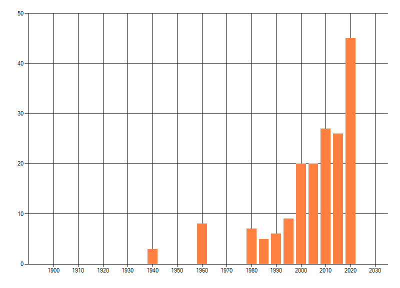 Het aantal atlasblokken (5x5 km) waarin de soort is gemeld binnen een periode van vijf jaar (vanaf 1980) of twintig jaar. Niet gecorrigeerd voor waarnemersinspanning en het aantal doorgegeven waarnemingen kan sterk variëren per periode, dus een trend in verspreiding kan hier niet direct uit worden afgelezen. Het opgegeven jaartal is het eerste jaar van de periode. Bron: gevalideerde waarnemingen uit de NDFF.