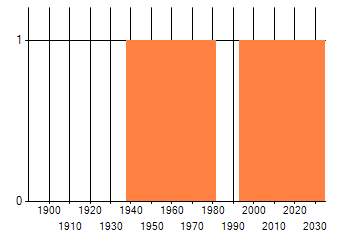 Het aantal atlasblokken (5x5 km) waarin de soort is gemeld binnen een periode van vijf jaar (vanaf 1980) of twintig jaar. Niet gecorrigeerd voor waarnemersinspanning en het aantal doorgegeven waarnemingen kan sterk variëren per periode, dus een trend in verspreiding kan hier niet direct uit worden afgelezen. Het opgegeven jaartal is het eerste jaar van de periode. Bron: gevalideerde waarnemingen uit de NDFF.