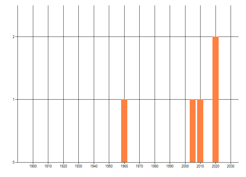 Het aantal atlasblokken (5x5 km) waarin de soort is gemeld binnen een periode van vijf jaar (vanaf 1980) of twintig jaar. Niet gecorrigeerd voor waarnemersinspanning en het aantal doorgegeven waarnemingen kan sterk variëren per periode, dus een trend in verspreiding kan hier niet direct uit worden afgelezen. Het opgegeven jaartal is het eerste jaar van de periode. Bron: gevalideerde waarnemingen uit de NDFF.