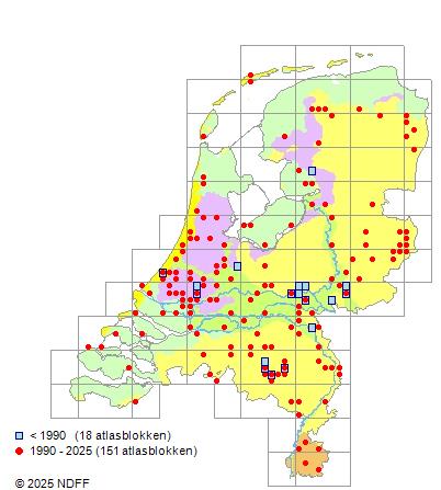 Het aantal atlasblokken (5x5 km) waarin de soort is gemeld binnen een periode van vijf jaar (vanaf 1980) of twintig jaar. Niet gecorrigeerd voor waarnemersinspanning en het aantal doorgegeven waarnemingen kan sterk variëren per periode, dus een trend in verspreiding kan hier niet direct uit worden afgelezen. Het opgegeven jaartal is het eerste jaar van de periode. Bron: gevalideerde waarnemingen uit de NDFF.