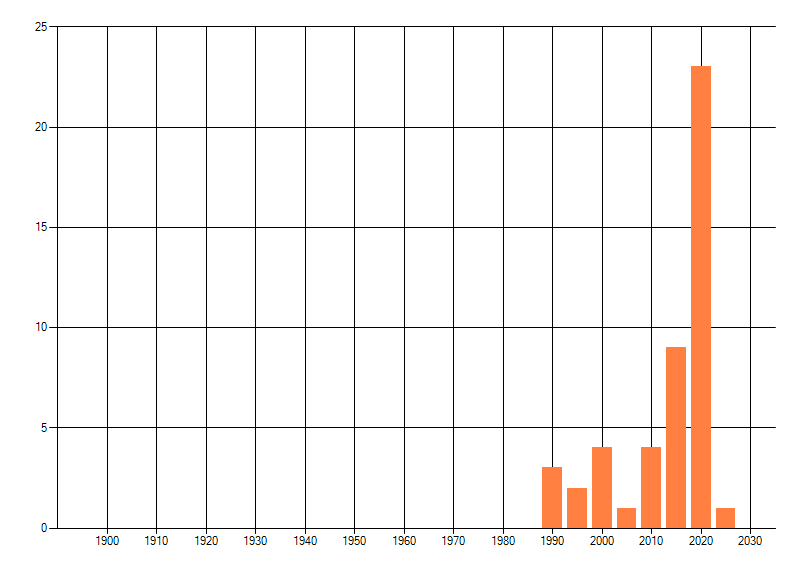 Het aantal atlasblokken (5x5 km) waarin de soort is gemeld binnen een periode van vijf jaar (vanaf 1980) of twintig jaar. Niet gecorrigeerd voor waarnemersinspanning en het aantal doorgegeven waarnemingen kan sterk variëren per periode, dus een trend in verspreiding kan hier niet direct uit worden afgelezen. Het opgegeven jaartal is het eerste jaar van de periode. Bron: gevalideerde waarnemingen uit de NDFF.