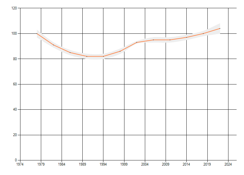 Gemiddelde trend van het aantal kilometerhokken waarin de soort voorkomt, weergegeven als indexcijfer (1975-1978 = 100).