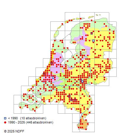 Het aantal atlasblokken (5x5 km) waarin de soort is gemeld binnen een periode van vijf jaar (vanaf 1980) of twintig jaar. Niet gecorrigeerd voor waarnemersinspanning en het aantal doorgegeven waarnemingen kan sterk variëren per periode, dus een trend in verspreiding kan hier niet direct uit worden afgelezen. Het opgegeven jaartal is het eerste jaar van de periode. Bron: gevalideerde waarnemingen uit de NDFF.