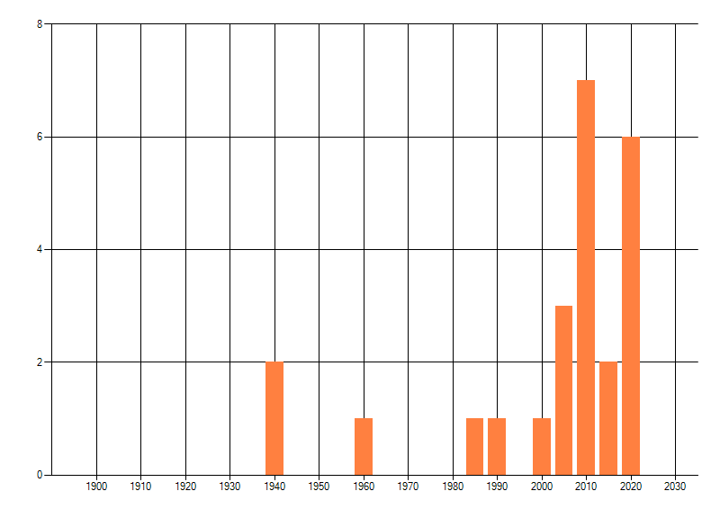 Het aantal atlasblokken (5x5 km) waarin de soort is gemeld binnen een periode van vijf jaar (vanaf 1980) of twintig jaar. Niet gecorrigeerd voor waarnemersinspanning en het aantal doorgegeven waarnemingen kan sterk variëren per periode, dus een trend in verspreiding kan hier niet direct uit worden afgelezen. Het opgegeven jaartal is het eerste jaar van de periode. Bron: gevalideerde waarnemingen uit de NDFF.
