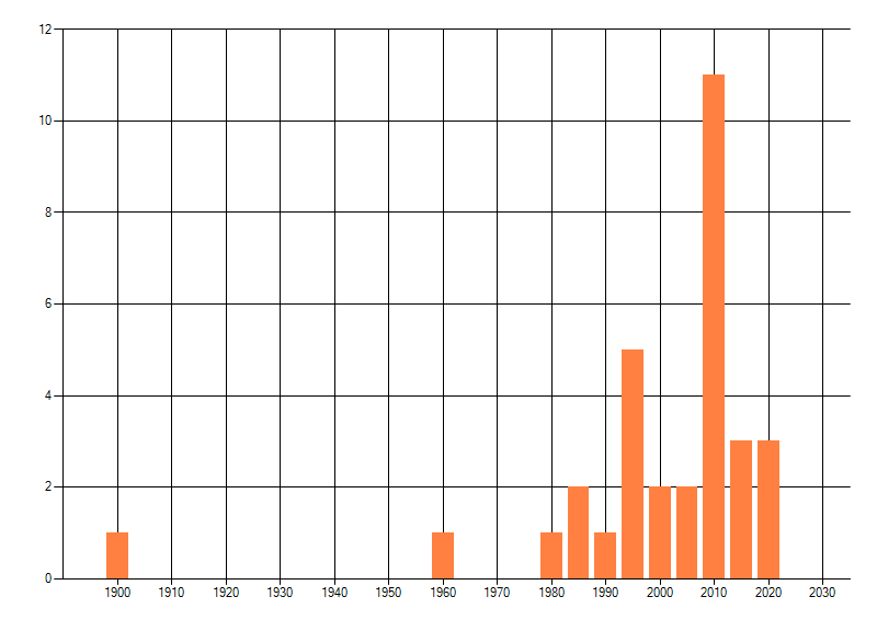 Het aantal atlasblokken (5x5 km) waarin de soort is gemeld binnen een periode van vijf jaar (vanaf 1980) of twintig jaar. Niet gecorrigeerd voor waarnemersinspanning en het aantal doorgegeven waarnemingen kan sterk variëren per periode, dus een trend in verspreiding kan hier niet direct uit worden afgelezen. Het opgegeven jaartal is het eerste jaar van de periode. Bron: gevalideerde waarnemingen uit de NDFF.