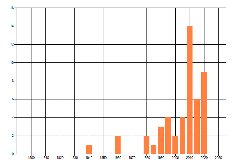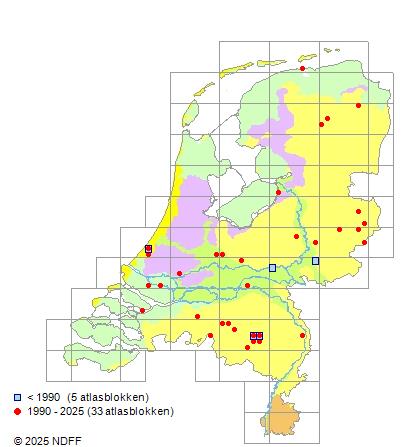 Het aantal atlasblokken (5x5 km) waarin de soort is gemeld binnen een periode van vijf jaar (vanaf 1980) of twintig jaar. Niet gecorrigeerd voor waarnemersinspanning en het aantal doorgegeven waarnemingen kan sterk variëren per periode, dus een trend in verspreiding kan hier niet direct uit worden afgelezen. Het opgegeven jaartal is het eerste jaar van de periode. Bron: gevalideerde waarnemingen uit de NDFF.