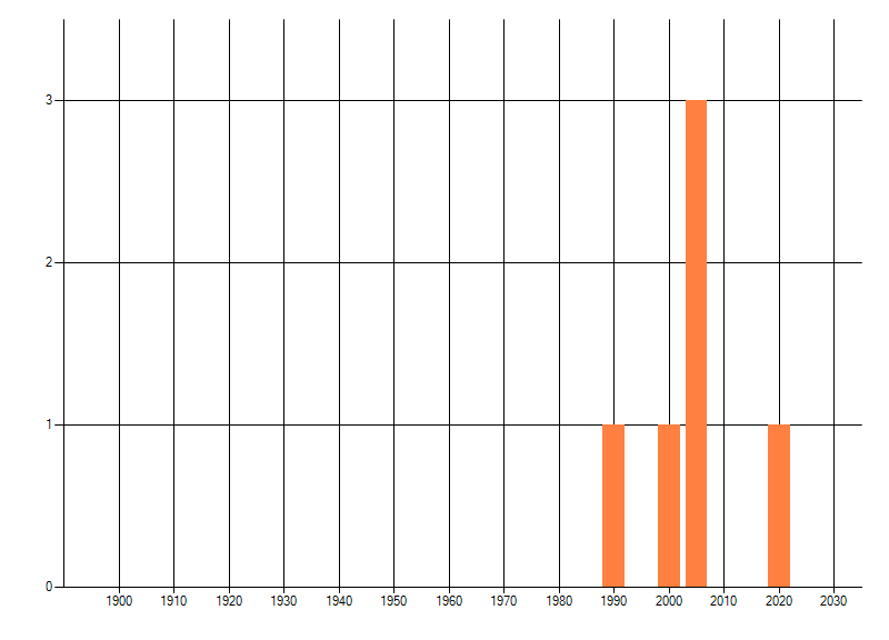 Het aantal atlasblokken (5x5 km) waarin de soort is gemeld binnen een periode van vijf jaar (vanaf 1980) of twintig jaar. Niet gecorrigeerd voor waarnemersinspanning en het aantal doorgegeven waarnemingen kan sterk variëren per periode, dus een trend in verspreiding kan hier niet direct uit worden afgelezen. Het opgegeven jaartal is het eerste jaar van de periode. Bron: gevalideerde waarnemingen uit de NDFF.