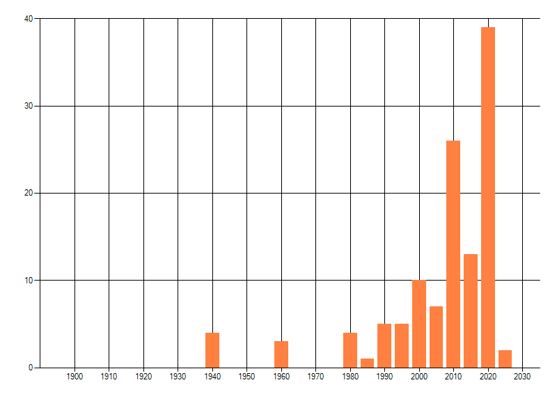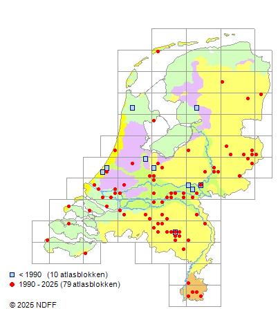 Het aantal atlasblokken (5x5 km) waarin de soort is gemeld binnen een periode van vijf jaar (vanaf 1980) of twintig jaar. Niet gecorrigeerd voor waarnemersinspanning en het aantal doorgegeven waarnemingen kan sterk variëren per periode, dus een trend in verspreiding kan hier niet direct uit worden afgelezen. Het opgegeven jaartal is het eerste jaar van de periode. Bron: gevalideerde waarnemingen uit de NDFF.