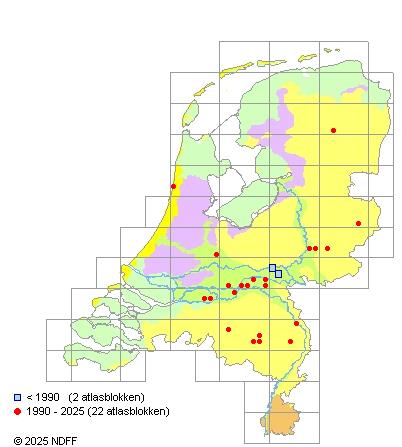 Het aantal atlasblokken (5x5 km) waarin de soort is gemeld binnen een periode van vijf jaar (vanaf 1980) of twintig jaar. Niet gecorrigeerd voor waarnemersinspanning en het aantal doorgegeven waarnemingen kan sterk variëren per periode, dus een trend in verspreiding kan hier niet direct uit worden afgelezen. Het opgegeven jaartal is het eerste jaar van de periode. Bron: gevalideerde waarnemingen uit de NDFF.