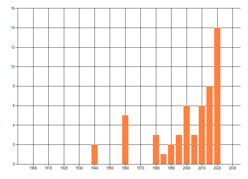 Het aantal atlasblokken (5x5 km) waarin de soort is gemeld binnen een periode van vijf jaar (vanaf 1980) of twintig jaar. Niet gecorrigeerd voor waarnemersinspanning en het aantal doorgegeven waarnemingen kan sterk variëren per periode, dus een trend in verspreiding kan hier niet direct uit worden afgelezen. Het opgegeven jaartal is het eerste jaar van de periode. Bron: gevalideerde waarnemingen uit de NDFF.