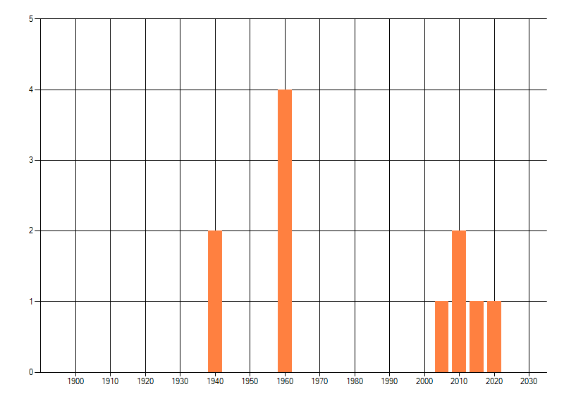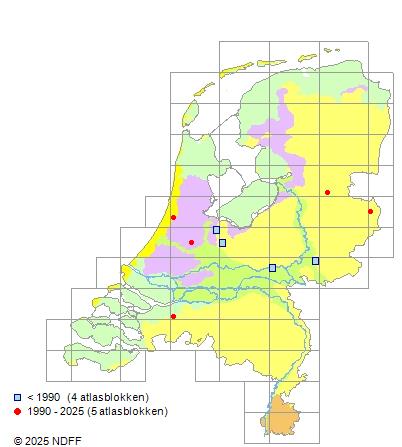 Het aantal atlasblokken (5x5 km) waarin de soort is gemeld binnen een periode van vijf jaar (vanaf 1980) of twintig jaar. Niet gecorrigeerd voor waarnemersinspanning en het aantal doorgegeven waarnemingen kan sterk variëren per periode, dus een trend in verspreiding kan hier niet direct uit worden afgelezen. Het opgegeven jaartal is het eerste jaar van de periode. Bron: gevalideerde waarnemingen uit de NDFF.