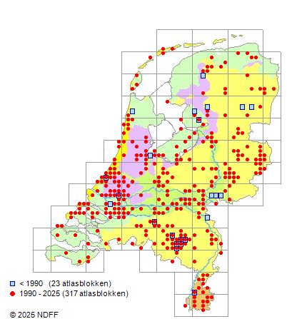 Het aantal atlasblokken (5x5 km) waarin de soort is gemeld binnen een periode van vijf jaar (vanaf 1980) of twintig jaar. Niet gecorrigeerd voor waarnemersinspanning en het aantal doorgegeven waarnemingen kan sterk variëren per periode, dus een trend in verspreiding kan hier niet direct uit worden afgelezen. Het opgegeven jaartal is het eerste jaar van de periode. Bron: gevalideerde waarnemingen uit de NDFF.