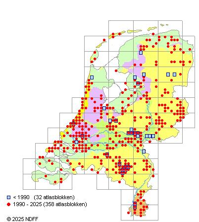 Het aantal atlasblokken (5x5 km) waarin de soort is gemeld binnen een periode van vijf jaar (vanaf 1980) of twintig jaar. Niet gecorrigeerd voor waarnemersinspanning en het aantal doorgegeven waarnemingen kan sterk variëren per periode, dus een trend in verspreiding kan hier niet direct uit worden afgelezen. Het opgegeven jaartal is het eerste jaar van de periode. Bron: gevalideerde waarnemingen uit de NDFF.
