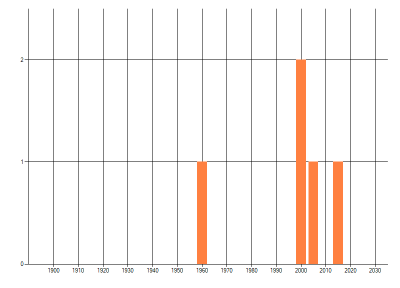 Het aantal atlasblokken (5x5 km) waarin de soort is gemeld binnen een periode van vijf jaar (vanaf 1980) of twintig jaar. Niet gecorrigeerd voor waarnemersinspanning en het aantal doorgegeven waarnemingen kan sterk variëren per periode, dus een trend in verspreiding kan hier niet direct uit worden afgelezen. Het opgegeven jaartal is het eerste jaar van de periode. Bron: gevalideerde waarnemingen uit de NDFF.