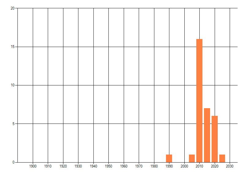 Het aantal atlasblokken (5x5 km) waarin de soort is gemeld binnen een periode van vijf jaar (vanaf 1980) of twintig jaar. Niet gecorrigeerd voor waarnemersinspanning en het aantal doorgegeven waarnemingen kan sterk variëren per periode, dus een trend in verspreiding kan hier niet direct uit worden afgelezen. Het opgegeven jaartal is het eerste jaar van de periode. Bron: gevalideerde waarnemingen uit de NDFF.