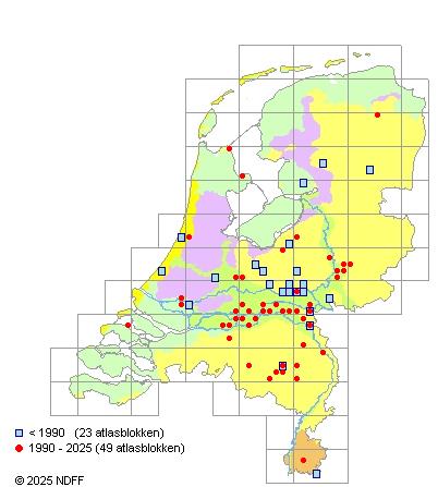 Het aantal atlasblokken (5x5 km) waarin de soort is gemeld binnen een periode van vijf jaar (vanaf 1980) of twintig jaar. Niet gecorrigeerd voor waarnemersinspanning en het aantal doorgegeven waarnemingen kan sterk variëren per periode, dus een trend in verspreiding kan hier niet direct uit worden afgelezen. Het opgegeven jaartal is het eerste jaar van de periode. Bron: gevalideerde waarnemingen uit de NDFF.