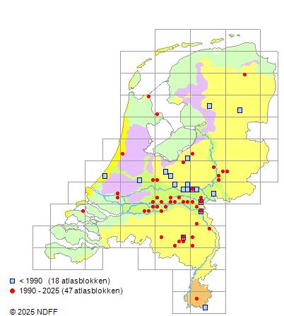 Het aantal atlasblokken (5x5 km) waarin de soort is gemeld binnen een periode van vijf jaar (vanaf 1980) of twintig jaar. Niet gecorrigeerd voor waarnemersinspanning en het aantal doorgegeven waarnemingen kan sterk variëren per periode, dus een trend in verspreiding kan hier niet direct uit worden afgelezen. Het opgegeven jaartal is het eerste jaar van de periode. Bron: gevalideerde waarnemingen uit de NDFF.