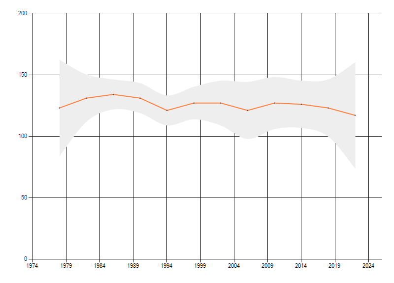 Gemiddelde trend van het aantal kilometerhokken waarin de soort voorkomt, weergegeven als indexcijfer (1975-1978 = 100). De trend is gecorrigeerd voor waarnemersinspanning en geeft de relatieve verandering in het aantal bezette kilometerhokken weer. Voor de berekening worden de data per periode van vier jaar samengenomen. In de grafiek correspondeert ieder punt met het laatste jaar van zo'n periode.